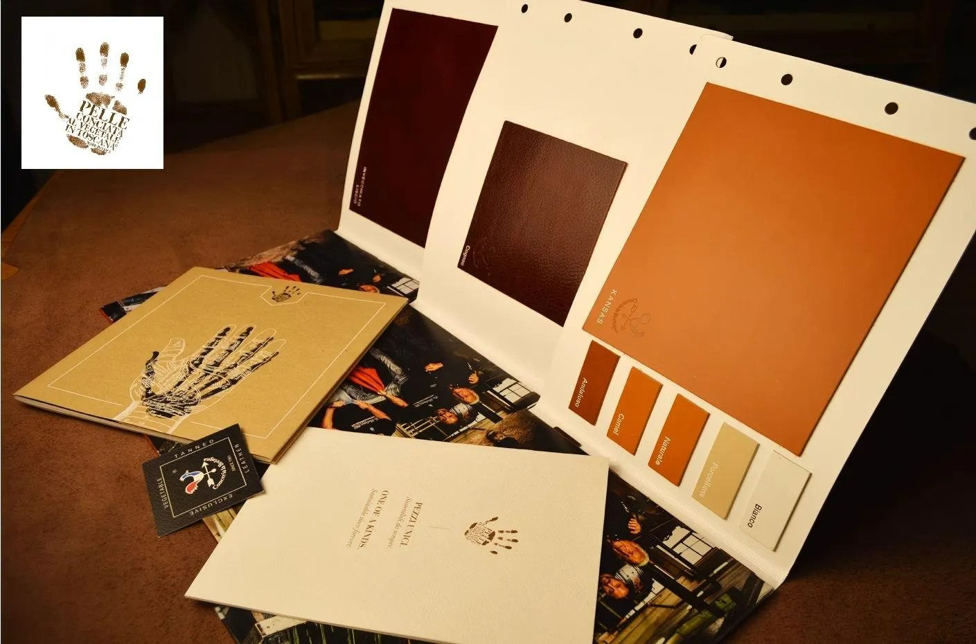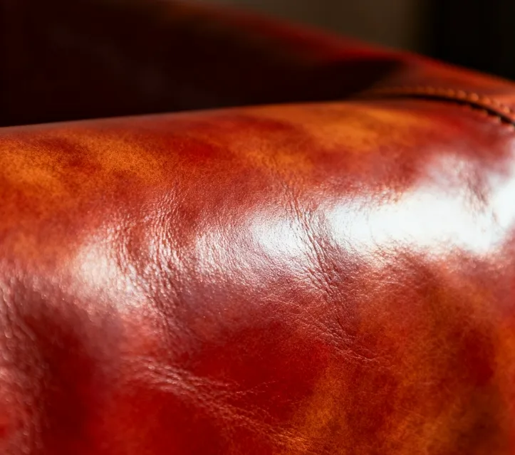 「タンポナート」は、当社自社タンナーで製造されるベジタブルタンニン鞣し革の一種です。熟練の職人が、綿布を染料に浸し、「バンバン」と音を立てながら革を叩き、手作業で色付けを行います。染色を何度も繰り返し、染めの濃淡を調整することで、この革特有の美しい風合いを生み出します。この革は、ベジタブルタンニン鞣し革ならではの自然な表情を感じられ、イタリア製オリジナル革にも引けを取らない品質です。当社が誇る革素材のひとつです。