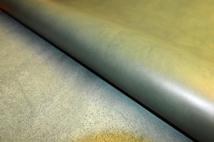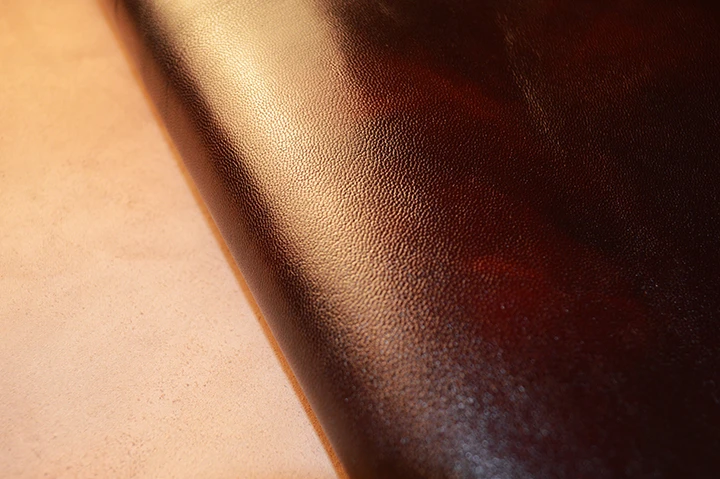 こちらはクロム鞣しのサイドカーフ(仔牛革)で、バッグや革小物に適しています。耐久性があり、スポーティな雰囲気のアイテムに最適な素材です。